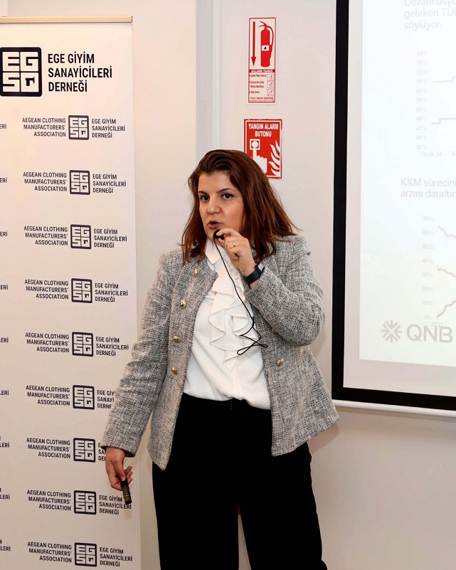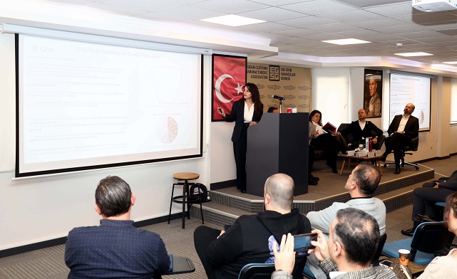 ‘Hazır Giyimde Uygulama Örnekleriyle Finansal Risk Yönetimi’ başlığıyla düzenlenen buluşmada küresel piyasalardaki son gelişmeler, Türkiye ekonomisindeki beklentiler ve ihracatçıların nakit akışını koruma yöntemleri detaylandırıldı.